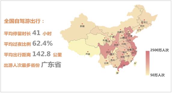 根據旅游大數據聯合實驗室數據統計,2017年上半年全國自駕游(跨市)游客共計2.23億人次,出行平均停留時長41小時左右,平均過夜比為62.4%,平均出行距離142.8公里。從出行省份上來看,廣東省出行人次排名第一,達到2292萬人次,江蘇1973萬人次排名第二,四川1655萬人次排名第三,排名四到十位的分別是河北、山東、陜西、湖南、安徽、浙江、湖北。